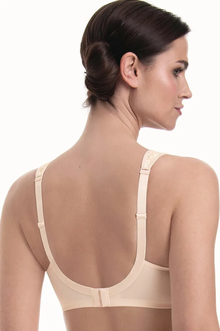 De Clara Art beugelloze BH van Anita is uitgevoerd in een witte animal print op een lichtroze achtergrond. Deze BH geeft niet alleen een goede ondersteuning aan de borsten, maar is daarnaast ook een prima basis BH door het bescheiden uiterlijk. Voor extra ondersteuning zijn de ondercups in grote maten dubbel verwerkt en worden de schouderbandjes en rugband bij toenemende maten breder. De BH is in het decolleté prachtig afgewerkt met een semitransparante inzet van dubbellaags voile.