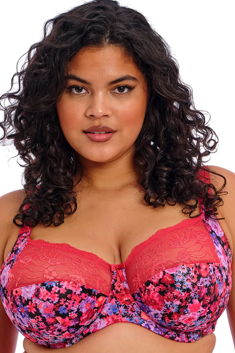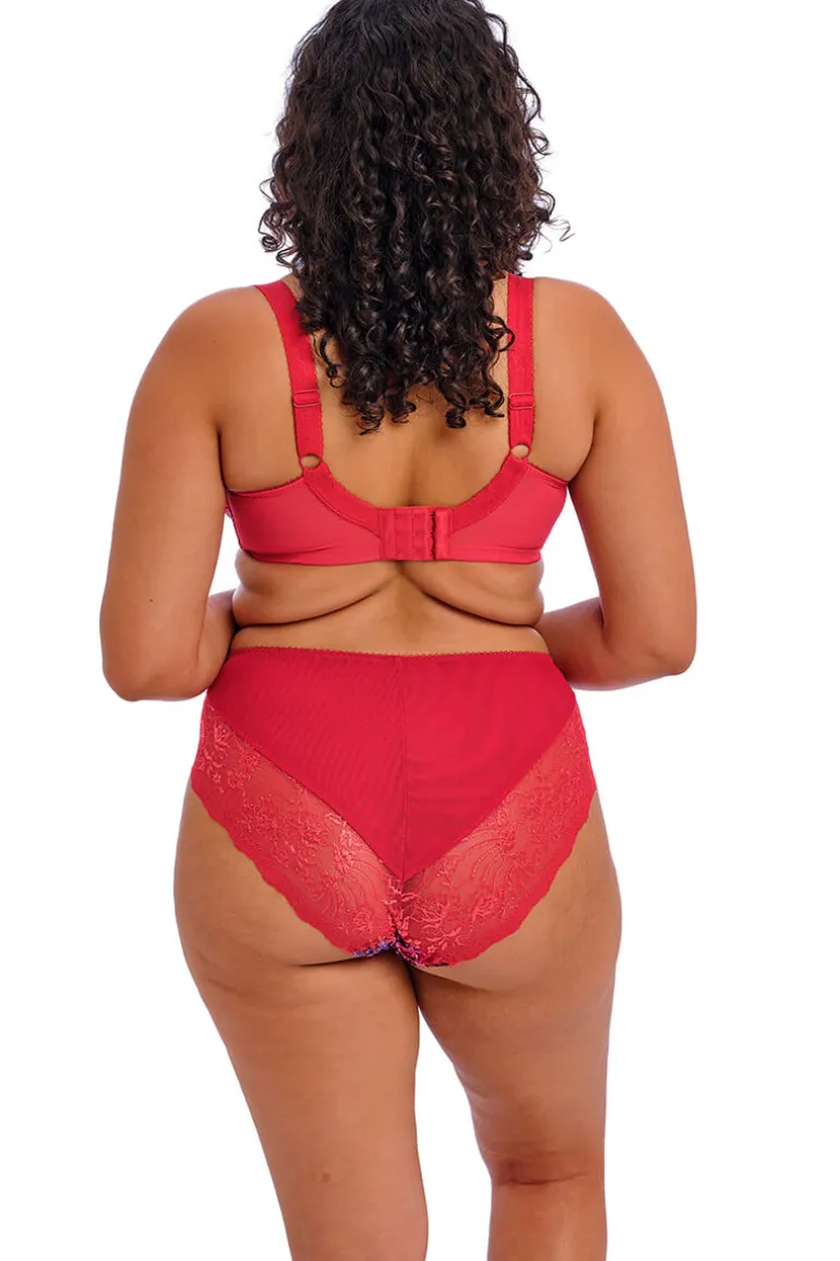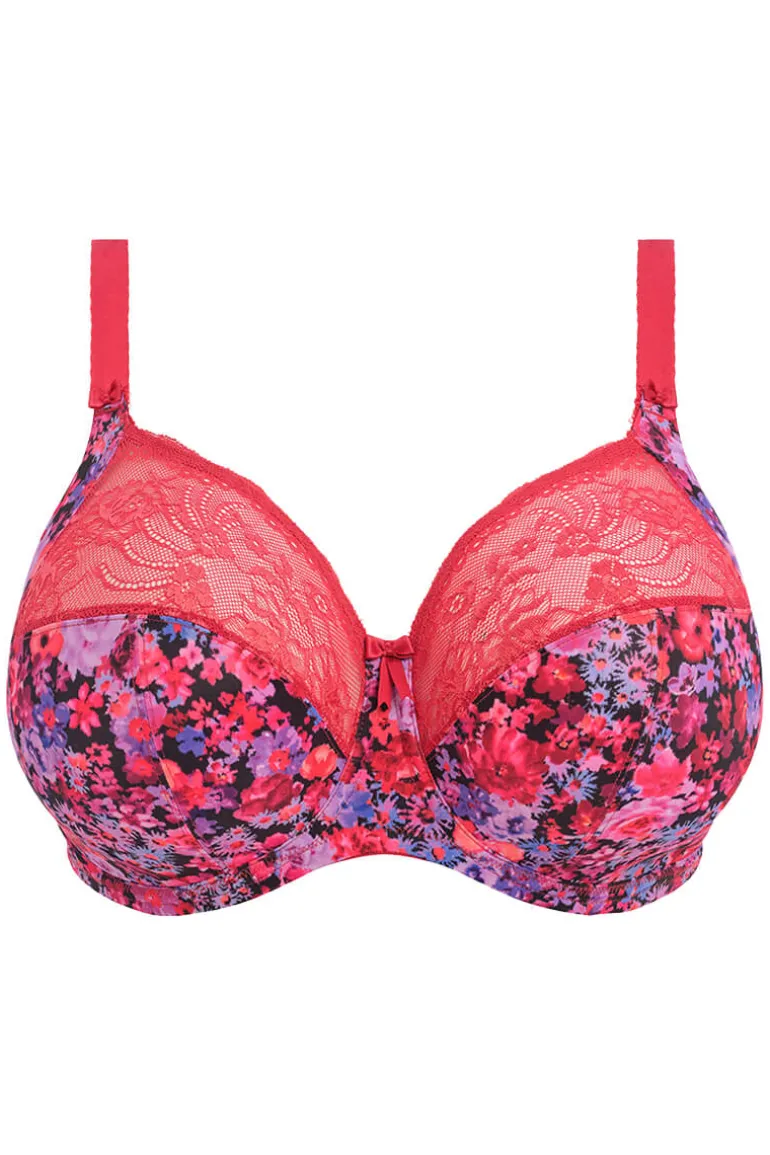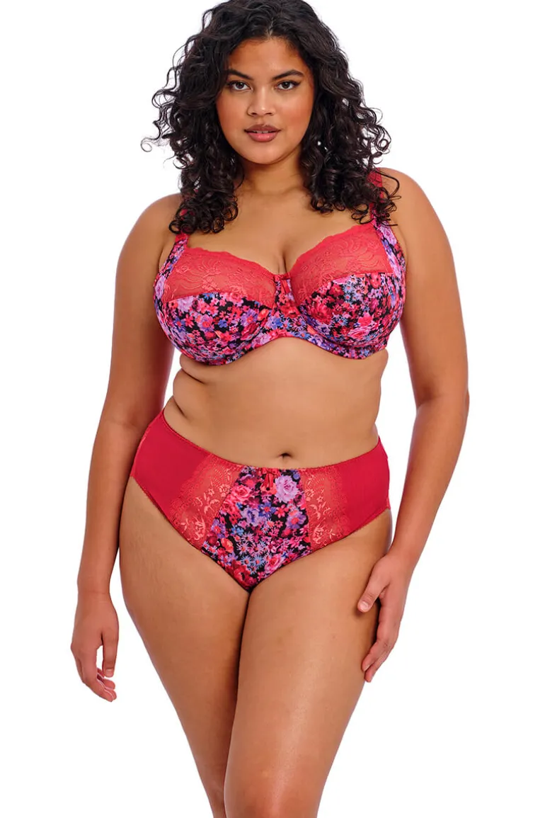 De Elomi Morgan BH met beugel is uitgevoerd in rood kant gecombineerd met een fleurige bloemenprint in rood, paars, blauw en zwart. Het bovenste gedeelte van de cup is afgewerkt met elastisch kant zodat de cup mooi aansluit op de borsten. De beugelBH is voorzien van een side support stuk in de cups. Dit zorgt ervoor dat de borsten goed naar het midden van het lichaam worden gebracht.