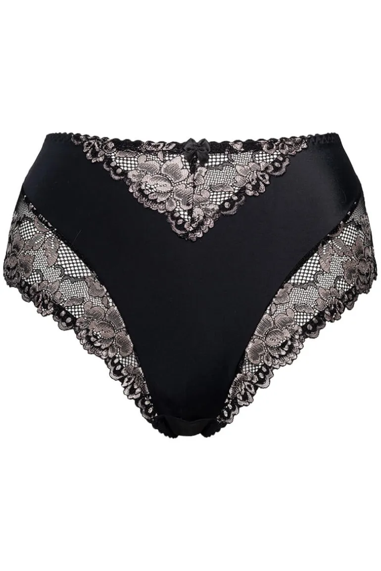 De Beate hoge slip in de kleur zwart en rosé goud combineer je met de Beate hele cup BH van Plaisir. Deze zeer comfortabele midi slip is net zoals de BH mooi afgewerkt met kant aan de voor- en bovenkant. Het kruisje is van katoen.