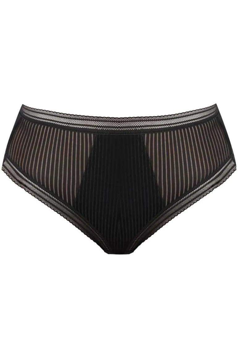 De Fusion slip van Fantasie is uitgevoerd in zwart. De slip heeft een streeppatroon en is langs de randjes afgewerkt met elastisch kant. Aan de achterkant zitten lichte plooitjes op de naad.