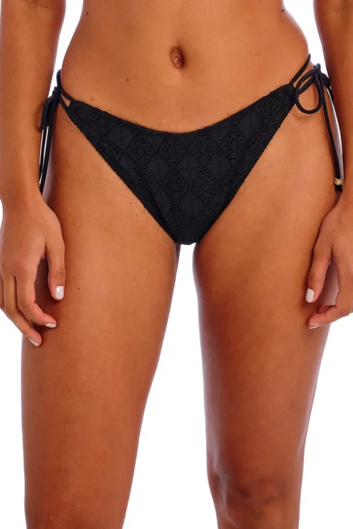 De Freya Nomad Nights high leg strikslip is uitgevoerd in zwart. De strikslip is gemaakt van een hippe gehaakte stof en volledig gevoerd. Aan de zijkanten strik je de bikinislip vast. De Nomad Nights serie is de nieuwe variant voor 2024 van de populaire Freya Sundance.