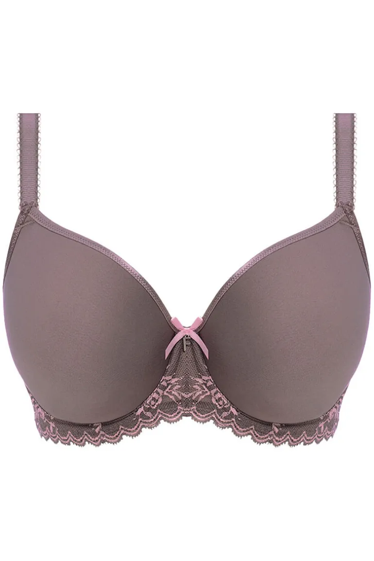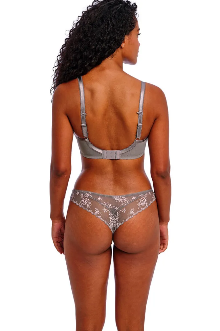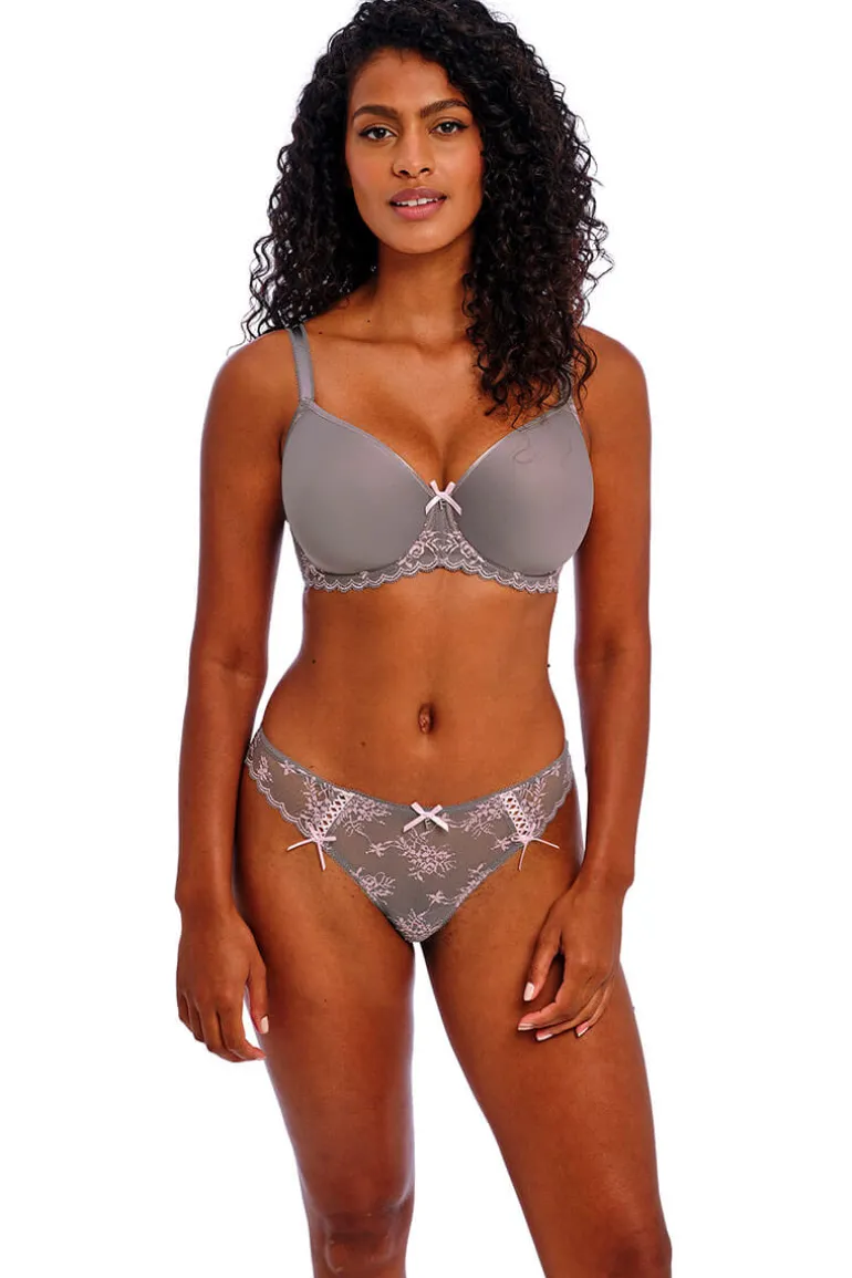 De Freya Offbeat Decadence voorgevormde BH Grey Pink is uitgevoerd in zacht grijs met roze kanten accenten. Deze BH biedt een comfortabele pasvorm met zijn lichte, ademende cups dankzij het spacer-materiaal. De verfijnde bloemenprint aan de zijkanten en tussen de cups voegt een stijlvolle touch toe aan deze gladde BH. Leuk te combineren met twee bijpassende slips uit de Freya Decadence Grey Pink serie.