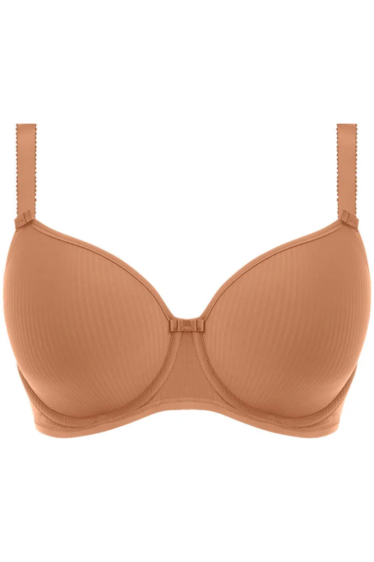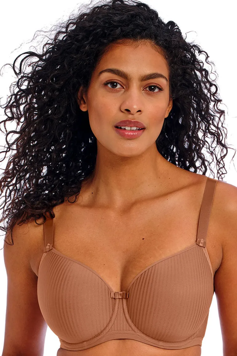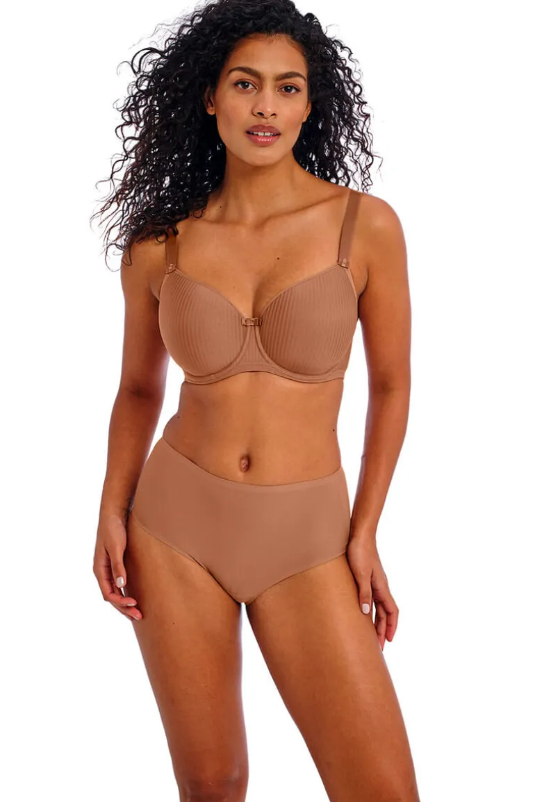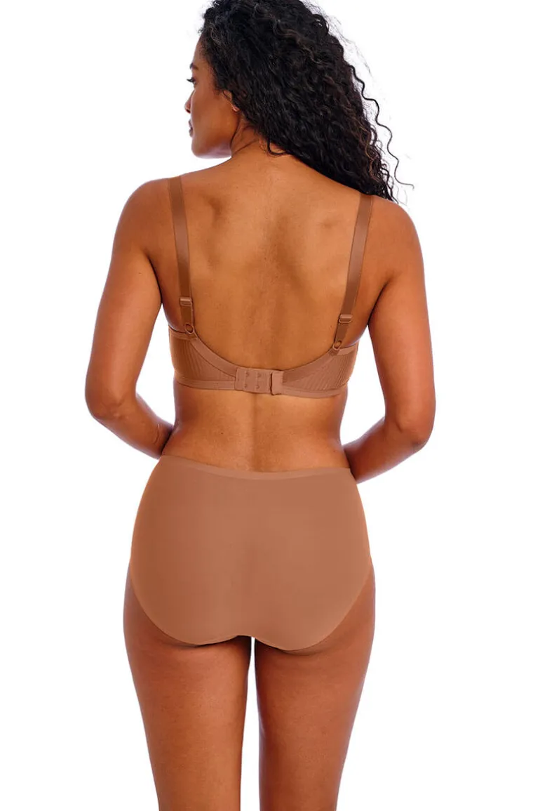 De Freya Idol voorgevormde balconnet BH is uitgevoerd in cinnamon. Heb je een goud bruine huid dan schijnt deze BH niet door onder lichte kleding. De stof is voorzien van een subtiel ingeweven streeppatroon in de kleur goud. In tegenstelling tot de favoriete Deco Plunge BH sluiten de beugels van de Idol BH tussen de cups wat hoger aan. Je borsten blijven hierdoor beter op hun plaats en krijgen een mooie ronding.