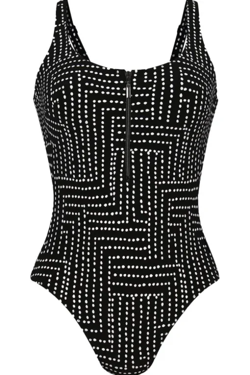 Het Rosa Faia Elouise Badpak Simple Art, onze bestseller, is voor 2025 uitgevoer in zwart met witte dots. Een sportief badpak met een ritssluiting in metallic bij het decolleté. Het badpak is beugelloos maar geeft door de voering bij de borsten een perfecte steun. De rug is rond en laag uitgesneden.