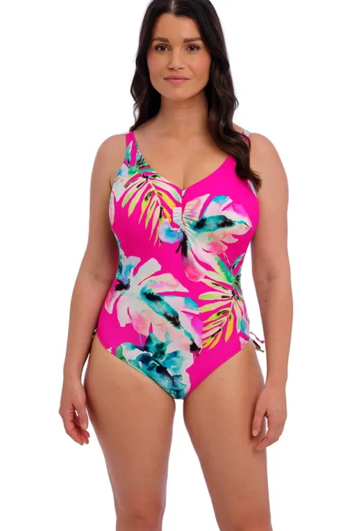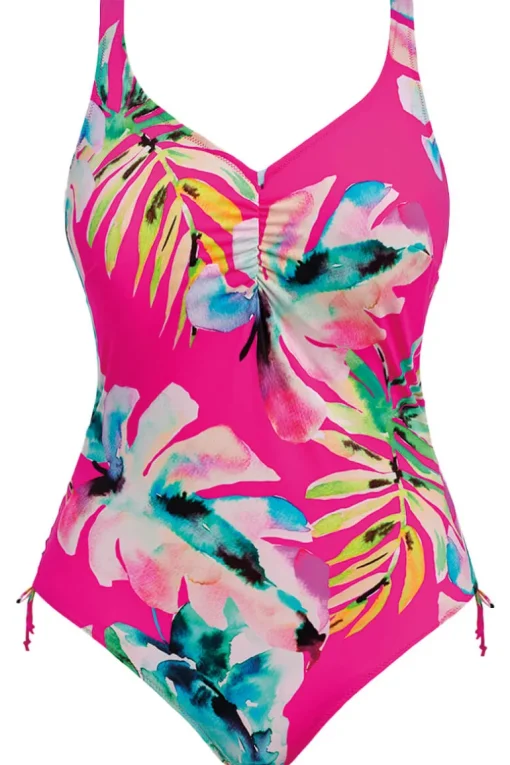Het Fantasie Badpak V-neck Carabelita Peony is uitgevoerd in een exclusieve Italiaanse print, met aquarel junglebladeren op een roze achtergrond. Dit V-hals badpak heeft verborgen beugels voor goede support. De verstelbare touwtjes aan de zijkant maken het mogelijk om het buikgebied te flatteren en bieden de optie om de bedekking van de benen naar wens aan te passen. De lage ronde achterkant zorgt voor een fijne pasvorm. Het badpak is volledig gevoerd.