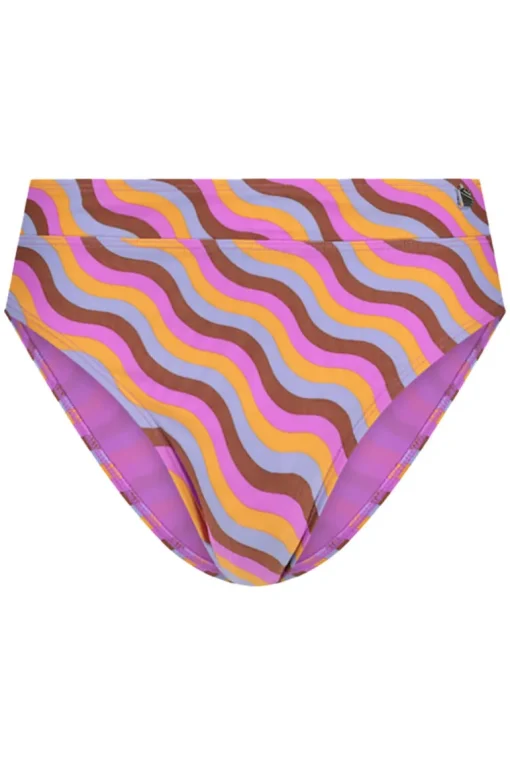 De Beachlife The Wave high waist bikinislip is uitgevoerd in super leuk printje van golfjes in de kleuren roze, oranje en blauw. Het broekje valt hoog op de heupen en is bij de benen hoog uitgesneden waardoor er een toffe retro look wordt gecreëerd.