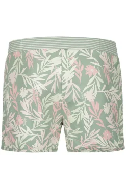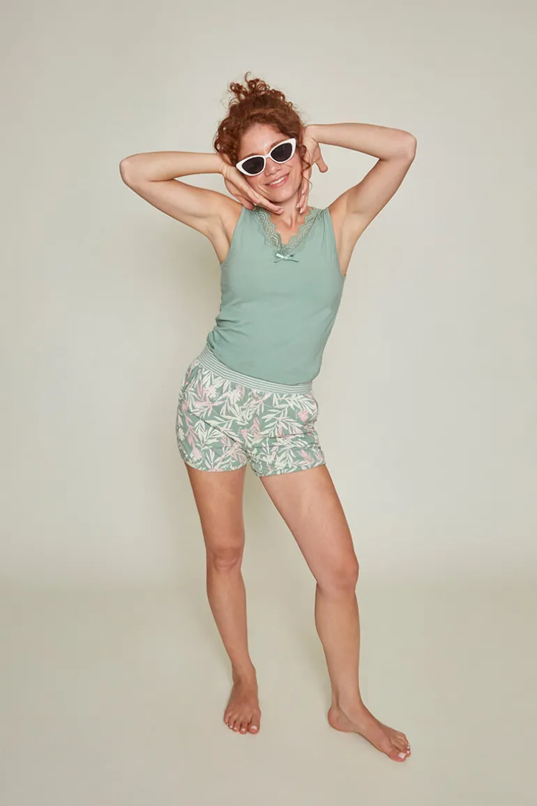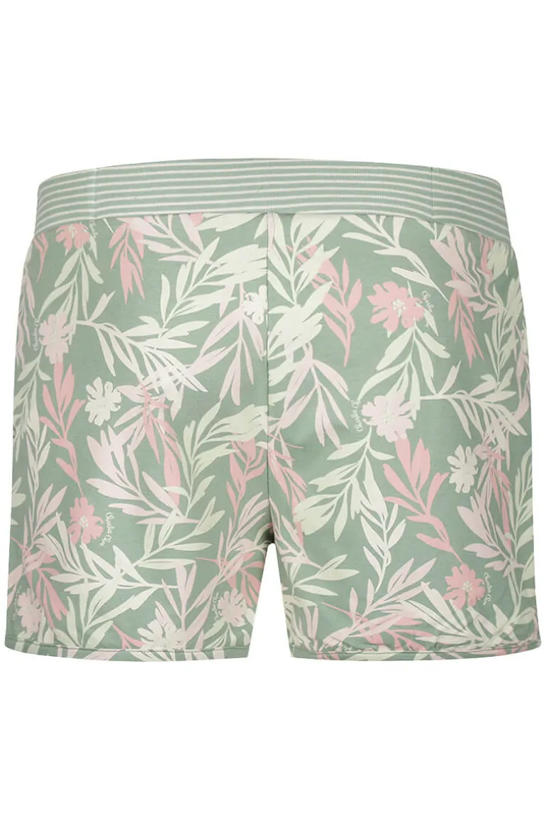 Charlie Choe Pyjama short Groen Bloemen is uitgevoerd in een print van gestileerde bloemen en bladeren in roze en lichtgroen. Dit leuke pyjama shortje heeft in de taille een brede elastische band en extra leuk detail zijn de twee glitter knoopjes aan de voorkant. Maak je pyjama set compleet met het bijpassende hemdje in groen.