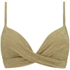 De Beachlife Twist bikini top Gold Glitter is uitgevoerd in een shiny goude glitterstof met lurex. De top heeft voorgevormde cups en beugels. Het gedraaide detail onder de cups geeft een luxe uitstraling. Dankzij de verstelbare schouderbandjes garandeert deze bikinitop een comfortabele en perfecte pasvorm, en is het een echte must-have.