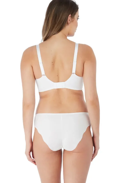 De Ana voorgevormde spacer BH van Fantasie is uitgevoerd in wit. De BH is gemaakt van spacer, een dubbele laag stof met daartussen een luchtlaag. Hierdoor zijn de cups bijna gewichtloos, ademend en mooi glad. Een gladde BH is vaak saai. Deze BH is mooi afgewerkt met een geometrisch printje op de cup en broderie versieringen tussen de cups en op de schouderbandjes.